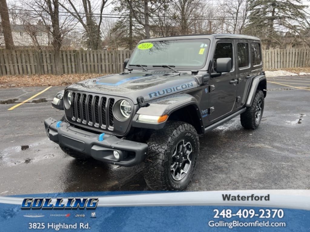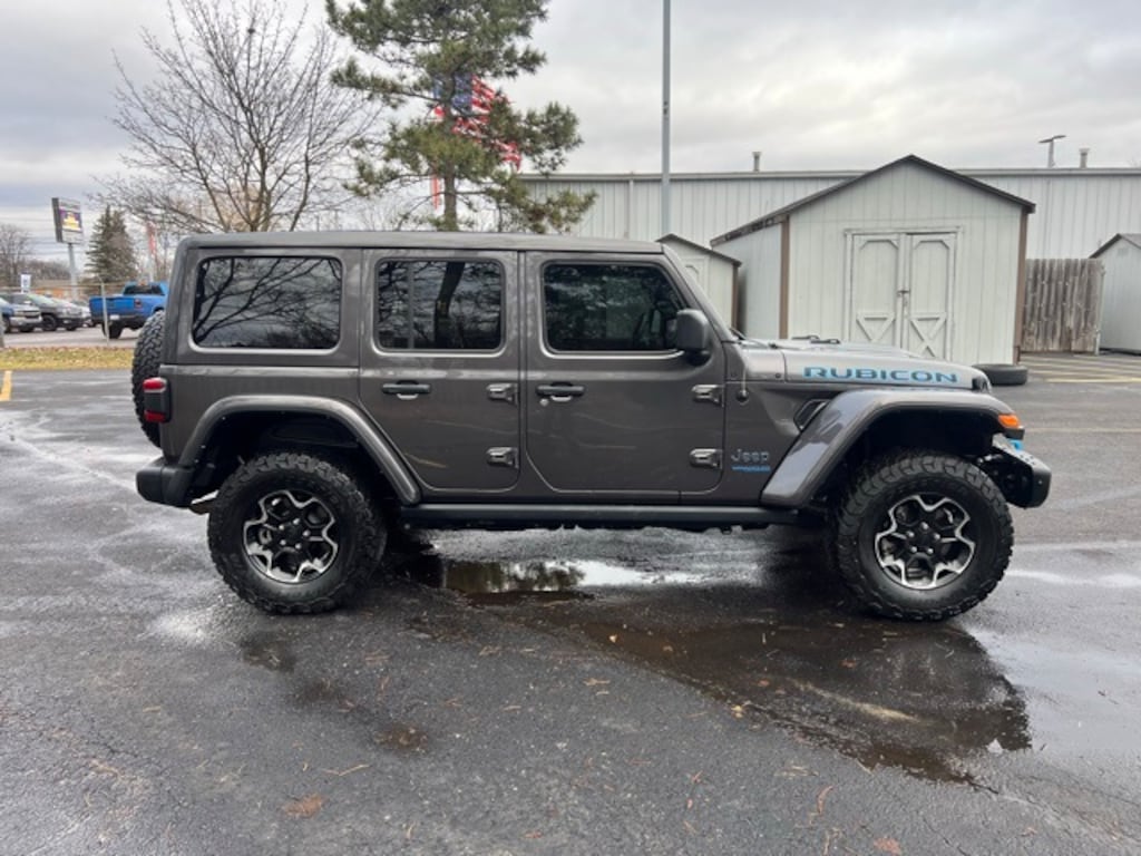 This is the cleanest one out there! Certified. Local Trade**, Wrangler Unlimited Rubicon 4xe Sky 1-Touch Power Top, 4D Sport Utility, 2.0L I4 DOHC, 8-Speed Automatic, 4WD, Granite Crystal Metallic Clearcoat, Black Leather, Wiring Harness 7 & 4 Pin, 4-Wheel Disc Brakes, 700 Amp Maintenance Free Battery, 9 Speakers, ABS brakes, Air Conditioning, Alloy wheels, AM/FM radio: SiriusXM, Apple CarPlay/Android Auto, Auto-dimming Rear-View mirror, Automatic temperature control, Auxiliary Switches, Blind Spot & Cross Path Detection, Body Color Fender Flares, Brake assist, Class II Receiver Hitch, Cold Weather Group, Compass, Cruise control, Delay-off headlights, Driver door bin, Driver vanity mirror, Dual front impact airbags, Dual front side impact airbags, Electronic Stability Control, Emergency communication system: SiriusXM Guardian, Front anti-roll bar, Front Bucket Seats, Front Center Armrest w/Storage, Front dual zone A/C, Front fog lights, Front reading lights, Fully automatic headlights, Garage door transmitter, Heated door mirrors, Heated Front Seats, Heated Steering Wheel, Illuminated entry, Integrated roll-over protection, Leather steering wheel, Low tire pressure warning, MOPAR All-Weather Floor Mats (DISC), Navigation System, Occupant sensing airbag, Outside temperature display, Panic alarm, ParkSense Rear Park Assist System, ParkView Rear Back-Up Camera, Passenger door bin, Passenger vanity mirror, Performance Suspension, Power door mirrors, Power steering, Power Top Quarter Window Storage Bag, Power windows, Premium Cloth Low-Back Bucket Seats, Quick Order Package 29V, Radio data system, Radio: Uconnect 4C Nav w/8.4" Display, Rear anti-roll bar, Rear reading lights, Rear Window Defroster, Rear Window Wiper/Washer, Remote keyless entry, Remote Proximity Keyless Entry, Remote Start System, Removable Rear Quarter Windows, Safety Group, Security system, Sky 1-Touch Power Top, Split folding rear seat, Steel Bumper Group, Steel Front Bumper, Steel Rear Bumper, Steering wheel mounted audio controls, Tachometer, Telescoping steering wheel, Tilt steering wheel, Traction control, Trailer Tow & HD Electrical Group, Trip computer, Voltmeter. CARFAX One-Owner.
