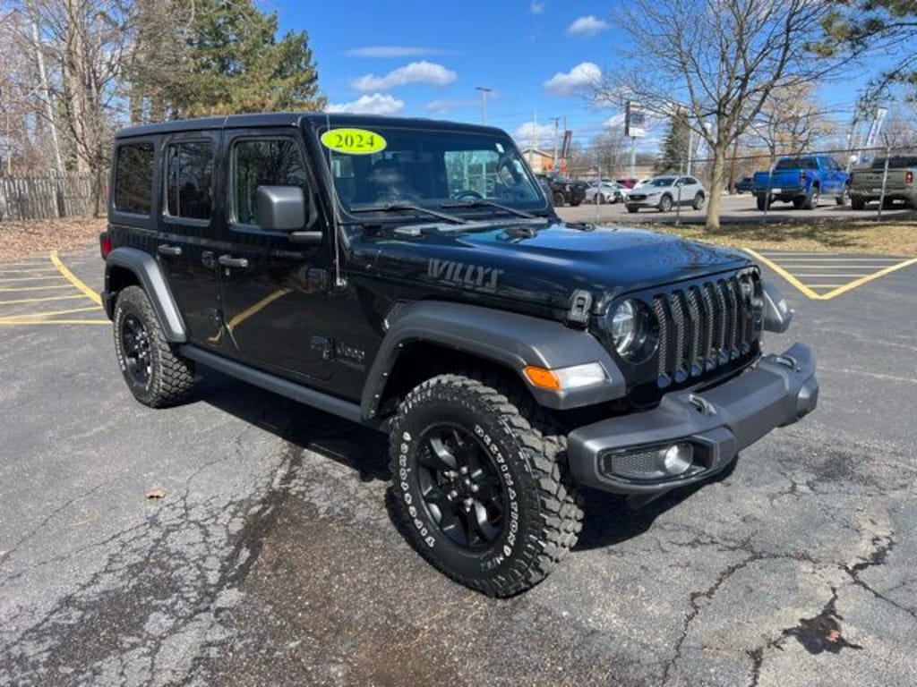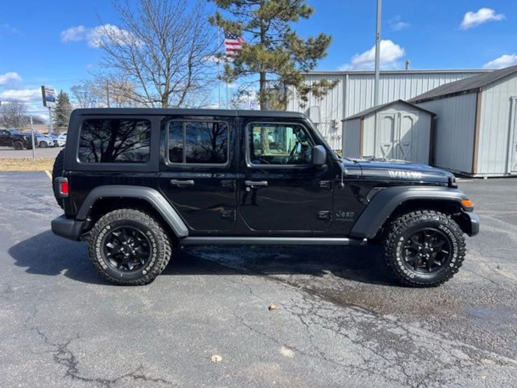 Brand new tires! Certified. We are Michigan's #1 Certified Pre-Owned Dealer!, 7-year/100,000-mile warranty!, Accident Free Carfax History Report, Wrangler Unlimited Willys, 4D Sport Utility, 3.6L V6 24V VVT, 8-Speed Automatic, 4WD, Black Clearcoat, Black Cloth, Wiring Harness 7 & 4 Pin, 1-Year SiriusXM Guardian Trial, 2-Door Passive Entry, Front Door Locks, 220 Amp Alternator, 240 Amp Alternator, 4-Wheel Drive Swing Gate Decal, 4G LTE Wi-Fi Hot Spot, 5-Year SiriusXM Traffic Service, 5-Year SiriusXM Travel Link Service, 700 Amp Maintenance Free Battery, 8.4" Radio & Premium Audio Group, 8.4" Touchscreen Display, 97 MPH Vehicle Max Speed Calibration, Air Conditioning, Air Conditioning w/Auto Temperature Control, Air Filtering, Alpine Premium Audio System, Anti-Spin Differential Rear Axle, Apple CarPlay/Android Auto, Auto-Dimming Rear-View Mirror, Automatic Headlamps, Aux Battery, Auxiliary Switches, Black 3-Piece Hard Top, Black Grille, Black Trail Rated Badge, Brake assist, Class II Receiver Hitch, Cloth Low-Back Bucket Seats, Cluster 7.0" TFT Color Display, Convenience Group, Cruise control, Deep Tint Sunscreen Windows, Delay-off headlights, Driver door bin, Driver vanity mirror, Electronic Stability Control, Emergency/Assistance Call, Engine Oil Cooler, Freedom Panel Storage Bag, Front 1-Touch Down Power Windows, Front Bucket Seats, Front Center Armrest w/Storage, Front fog lights, Front LED Fog Lamps, Front reading lights, GPS Navigation, HD Radio, Leather Wrapped Steering Wheel, LED Headlamp & Fog Lamp Group, LED Premium Reflector Headlamps, Matte Black Jeep Badge, Mold In Color Bumper w/Gloss Black, MOPAR All-Weather Floor Mats, No Soft Top, Normal Duty Suspension, Off-Road Info Pages, Outside temperature display, ParkView Rear Back-Up Camera, Passenger door bin, Passenger vanity mirror, Power Heated Mirrors, Power steering, Quick Order Package 24W Willys, Radio data system, Radio: Uconnect 4 w/7" Display, Radio: Uconnect 4C Nav w/8.4" Display, Rear reading lights, Rear Window Defroster, Rear Window Wiper/Washer, Remote Keyless Entry, Security Alarm, SiriusXM Radio Service, SiriusXM Satellite Radio, SiriusXM Traffic Plus, SiriusXM Travel Link, Speed Sensitive Power Locks, Split folding rear seat, Steering wheel mounted audio controls, Stop-Start Dual Battery System, Sun Visors w/Illuminated Vanity Mirrors, Tachometer, Technology Group, Tilt steering wheel, Traction control, Trailer Tow & HD Electrical Group, Trip computer, Universal Garage Door Opener, Variably intermittent wipers, Wheels: 17" x 7.5" Black Steel Styled, Wheels: 17" x 7.5" Moab Black Aluminum, Willys, Willys Hood Decal. Clean CARFAX.